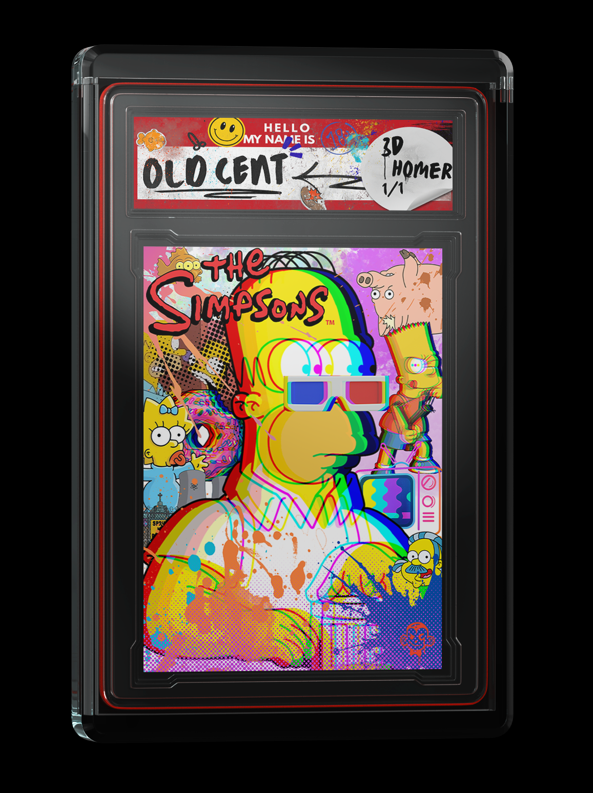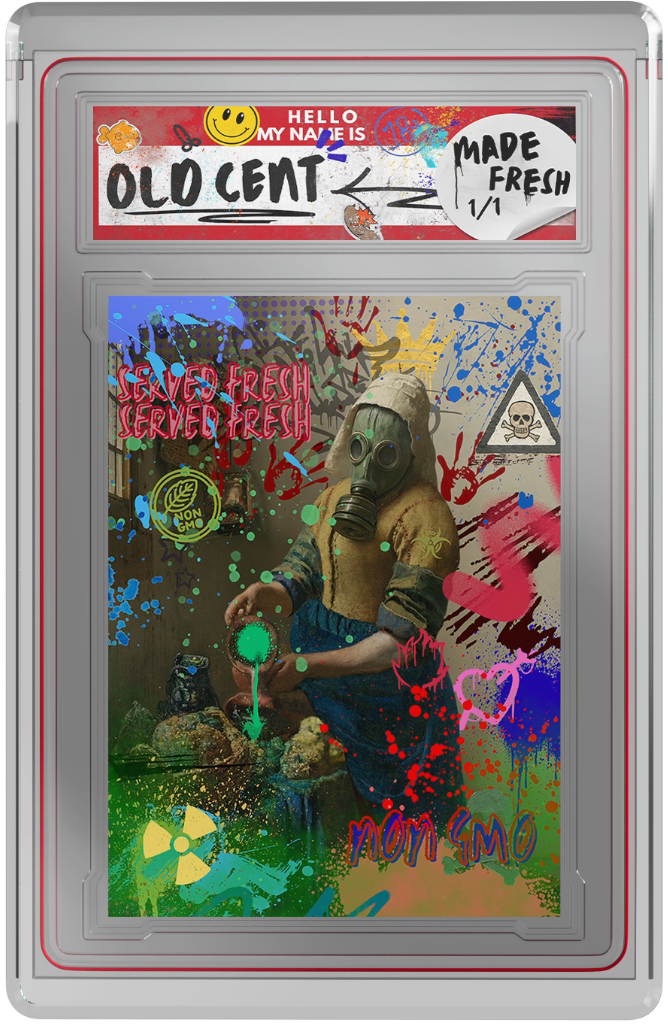 Old Cent is a mixed media collage artist who creates small-format art cards (2.5 x 3.5 inches) using a combination of digital tools and traditional methods. Their work incorporates fragments of famous paintings, iconic characters, graffiti, and visual symbols to produce layered, high-contrast compositions. They often start with hand-drawn sketches or paper collages, which are then scanned and edited digitally using software like Procreate and Photoshop.