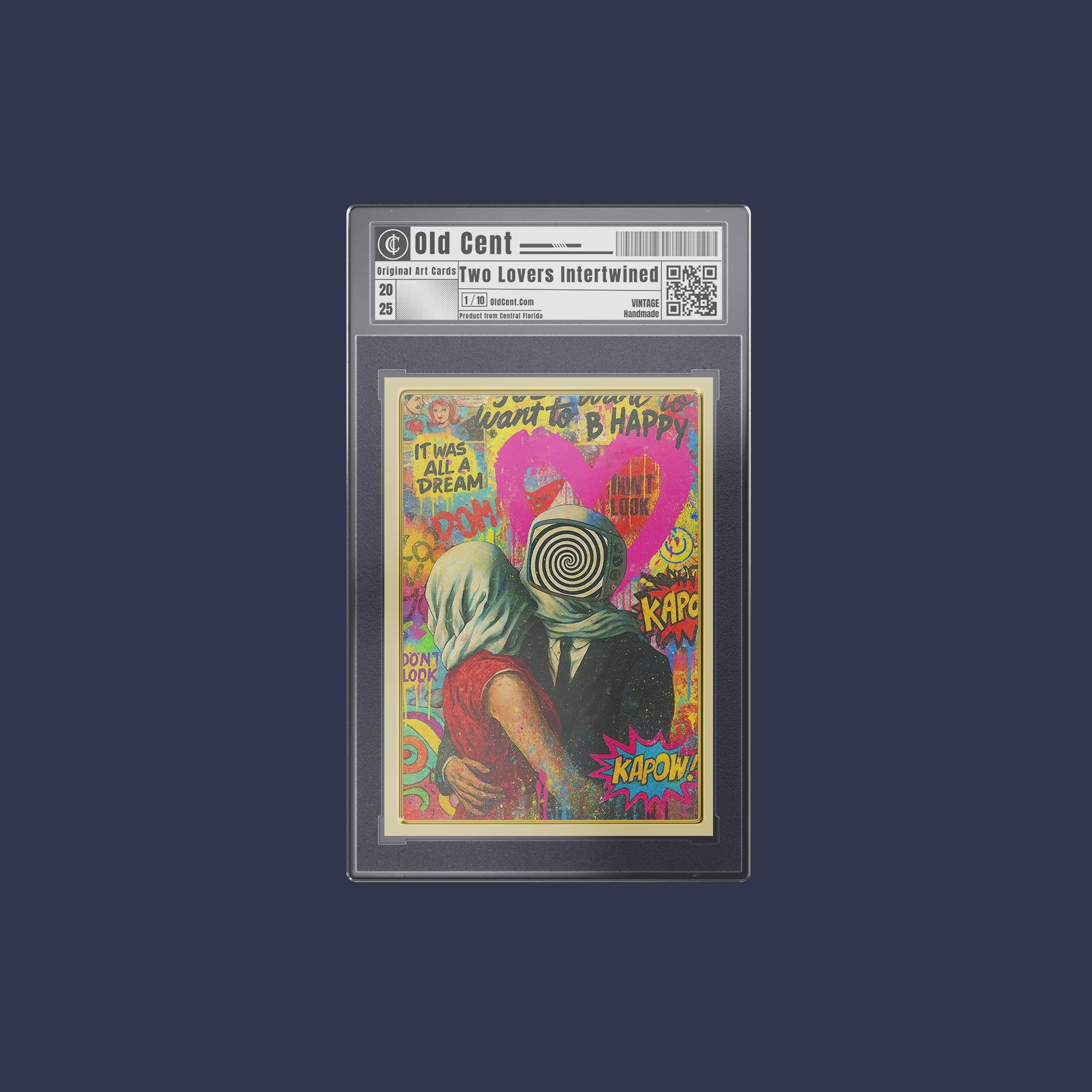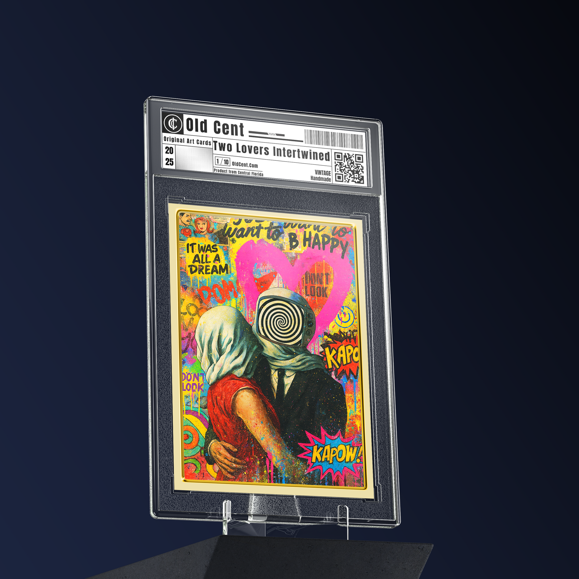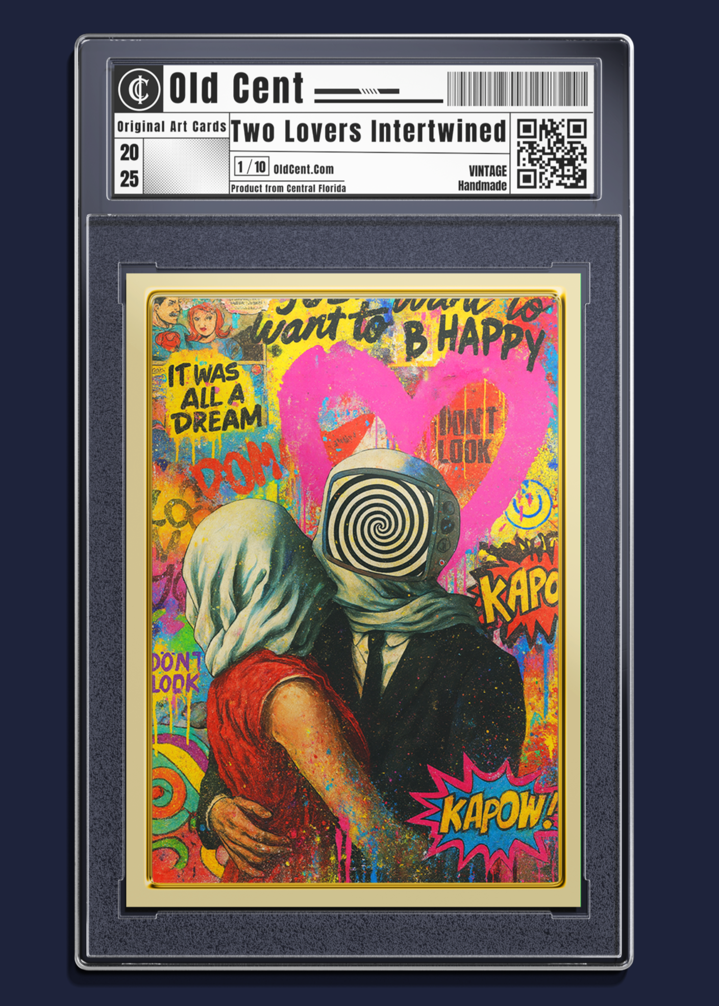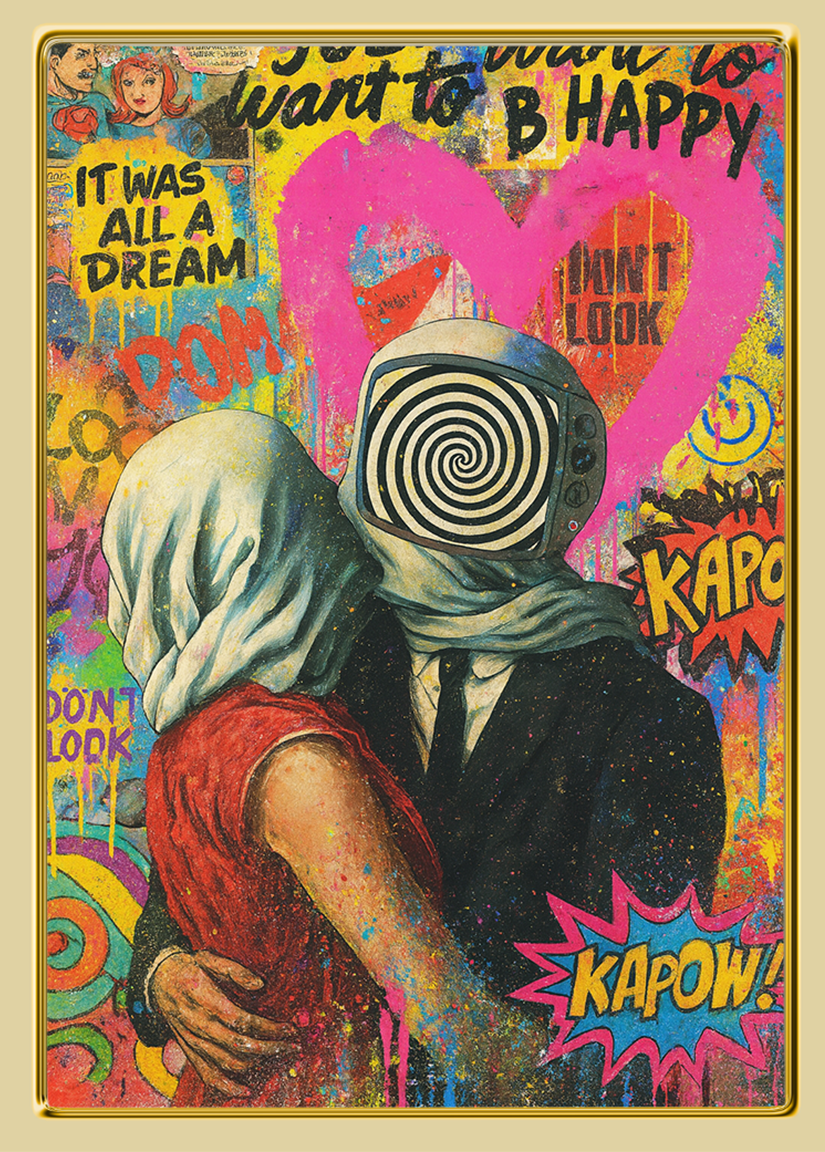 This bold, chaotic masterpiece fuses pop art, street graffiti, and surrealism in a tribute to love, illusion, and rebellion. A hypnotic television-headed figure embraces a veiled partner—an echo of Magritte’s “The Lovers”—set against a backdrop exploding with comic-style graphics, dripping neons, and phrases like “It Was All A Dream”, “KAPOW!”, and “DON’T LOOK.” A massive pink heart looms behind them, ironically framing their blindness and mind control.